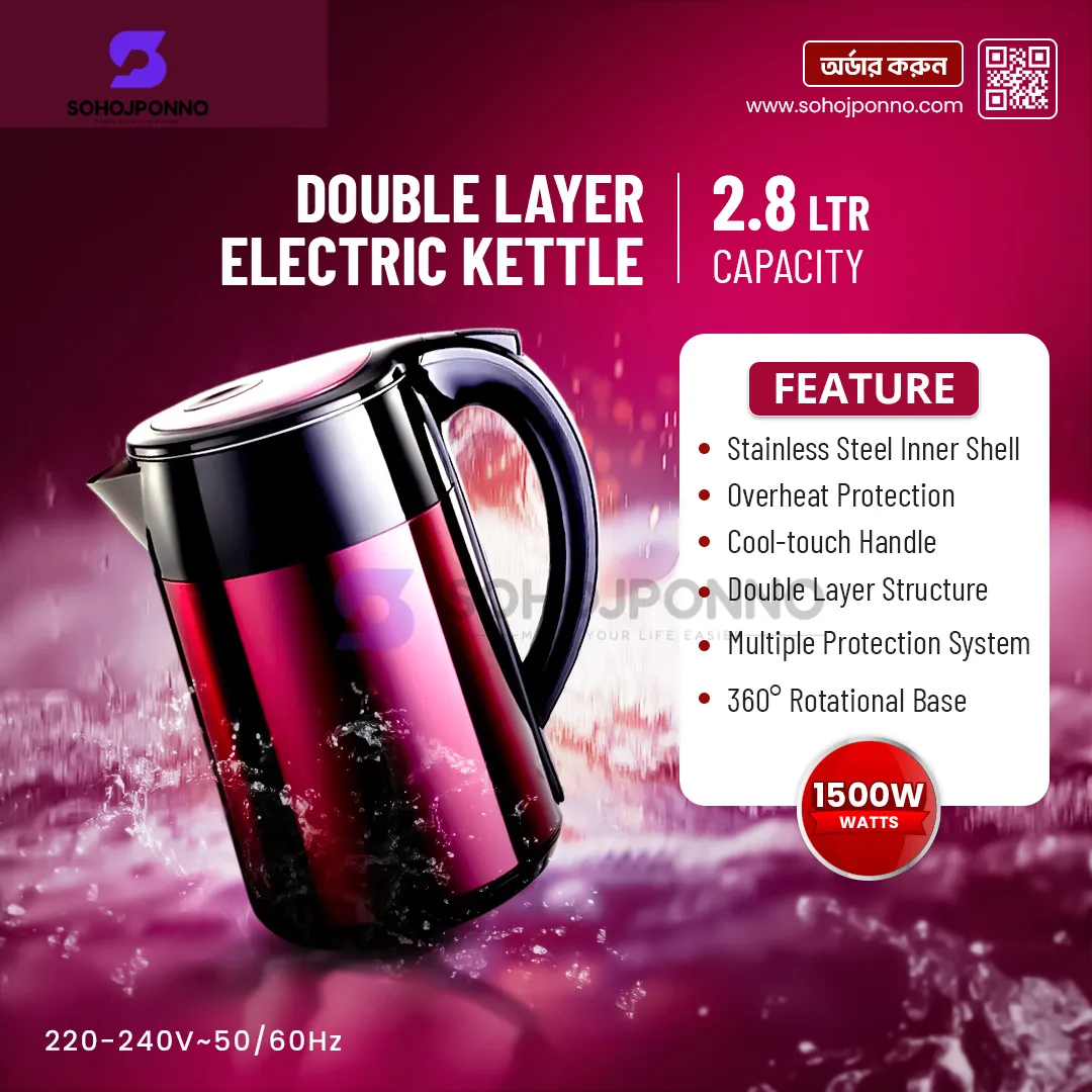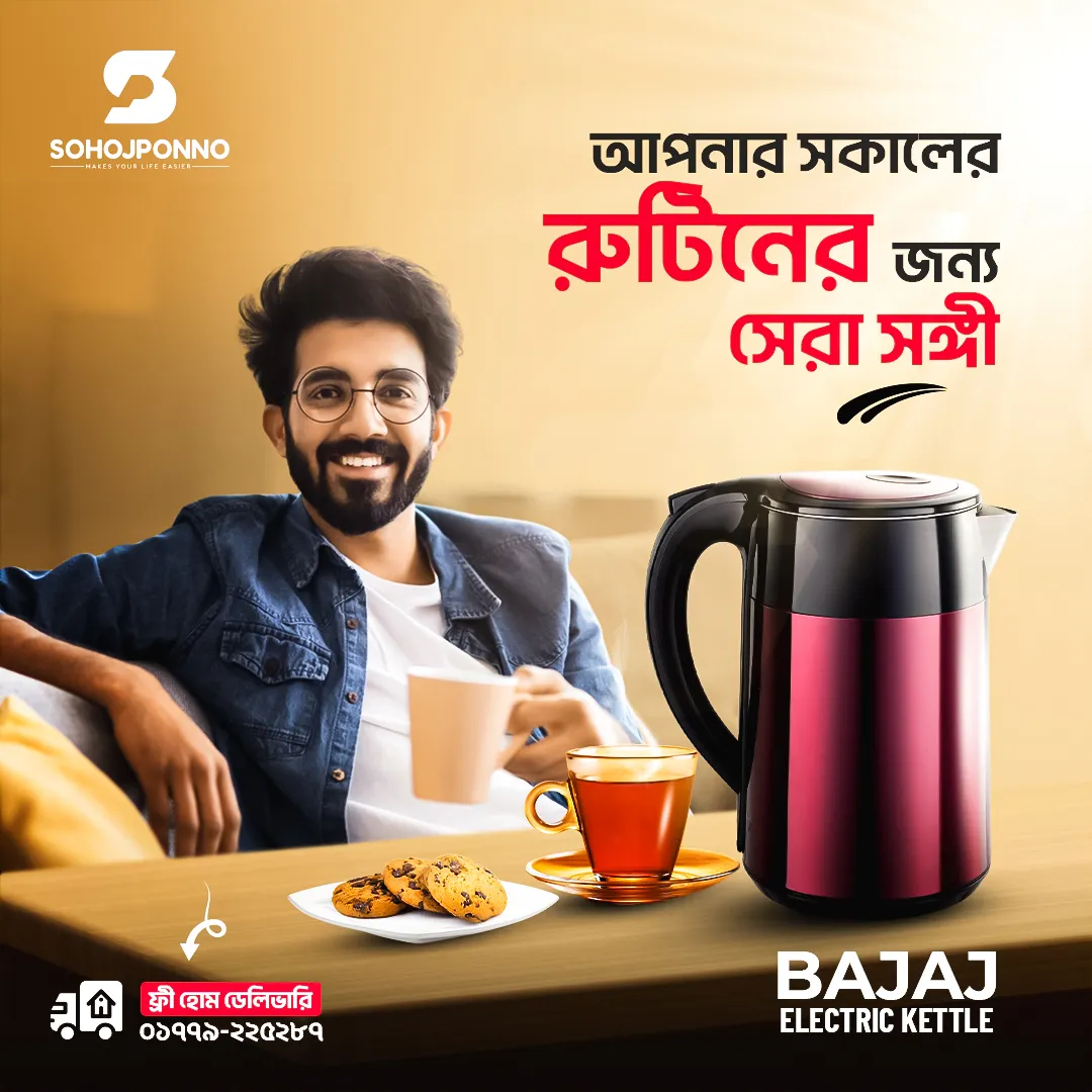 SOHOJPONNO নিয়ে এসেছে Bajaj AE-22T 2.8 লিটার ডাবল লেয়ার ইলেকট্রিক কেটলি, যা আপনার দৈনন্দিন ব্যবহারের জন্য একটি নির্ভরযোগ্য পছন্দ।