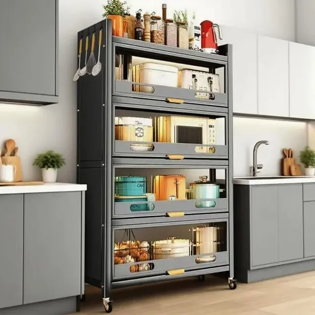 The robust construction supports substantial weight across all five shelves, making it ideal for housing microwaves, air fryers, coffee makers, and other appliances on upper tiers while storing heavier items like pots, pans, and bulk supplies below. The transparent acrylic doors provide instant visual inventory of your stored items while creating an effective barrier against kitchen elements.