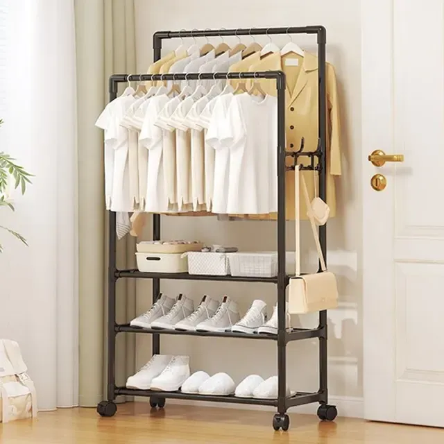 Tired of cluttered closets and clothes piled on chairs? This Double Pole Standing Clothes Rack is the perfect solution for bringing order and modern style to your space. Its sleek, minimalist design provides ample storage without overwhelming your room, making it an ideal choice for apartments, dorms, or anyone needing extra wardrobe space. Finally, you can organize your outfits, shoes, and accessories in one convenient, stylish place.