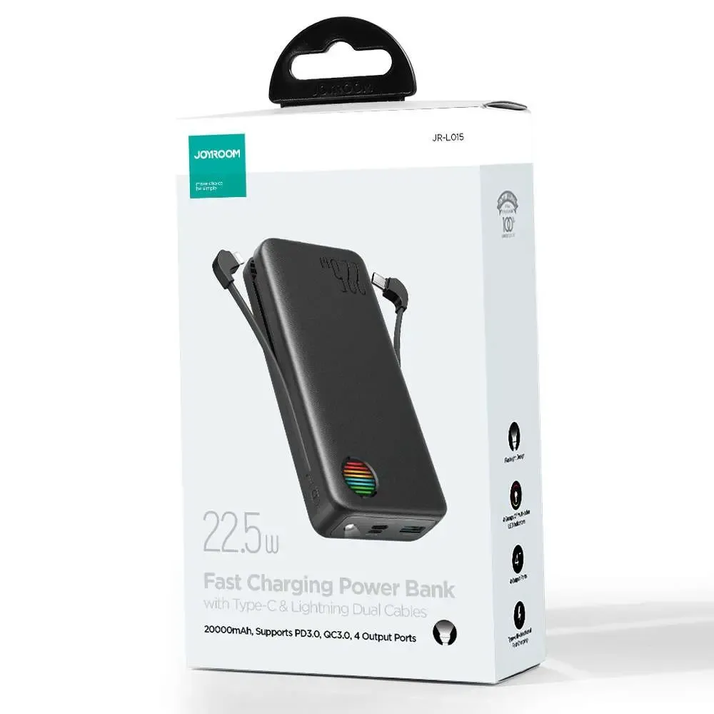 Joyroom JR-L015 20000mAh power bank with dual Type-C & Lightning cables, 22.5W fast charging, 4 output ports, LED indicators, and built-in flashlight for portable all-day power.